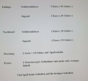 Osterschießen Intern 2024 18. März 2024 Siegfried Gawarzewski Lustig und Aufregend wurden die Punkte auf der Spaßscheibe gesammelt. Regeln und Einsatz Natürlich bekam jeder ein Osternest