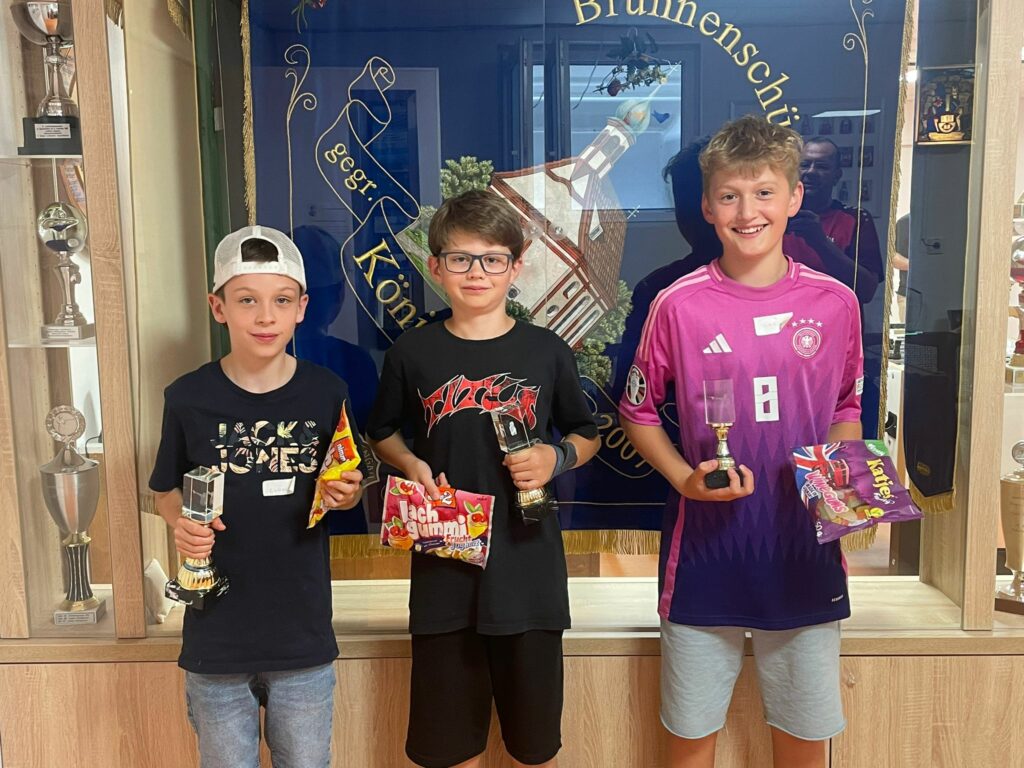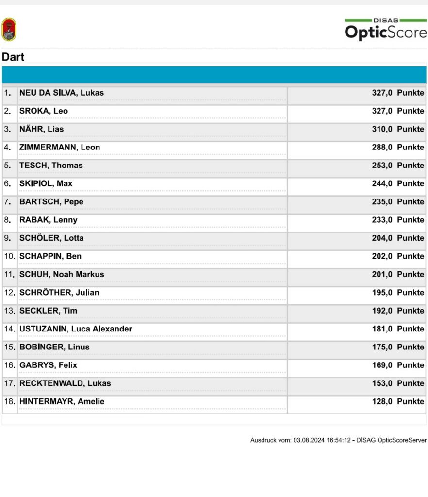 Stechschuss Platz 1 und 2, hier ging es richtig ab, erst beim 3. Durchgang konnte NEU DA SILVA LUKAS ( weißes Käppi ) mit 25 zu 18 Punkten, sich gegen SROKA LEO den 1. Platz sichern. Platz 3 ging an NÄHR LIAS.
