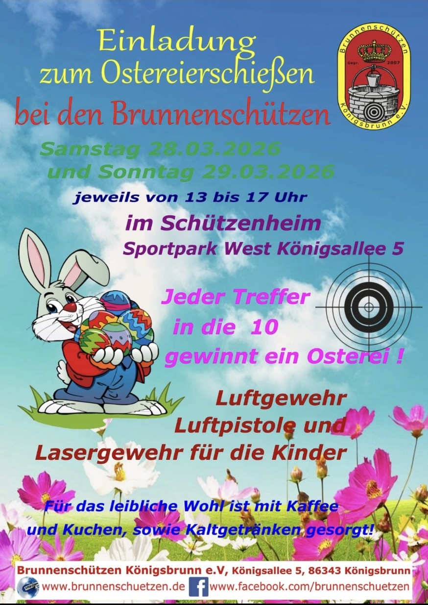 Traditionelles Osterschießen 2026 17. März 2026 Siegfried Gawarzewski Auch dieses Jahr laden wir alle Schützen, Freunde, Bekannte, Verwandte und neugierige Gäste ein.